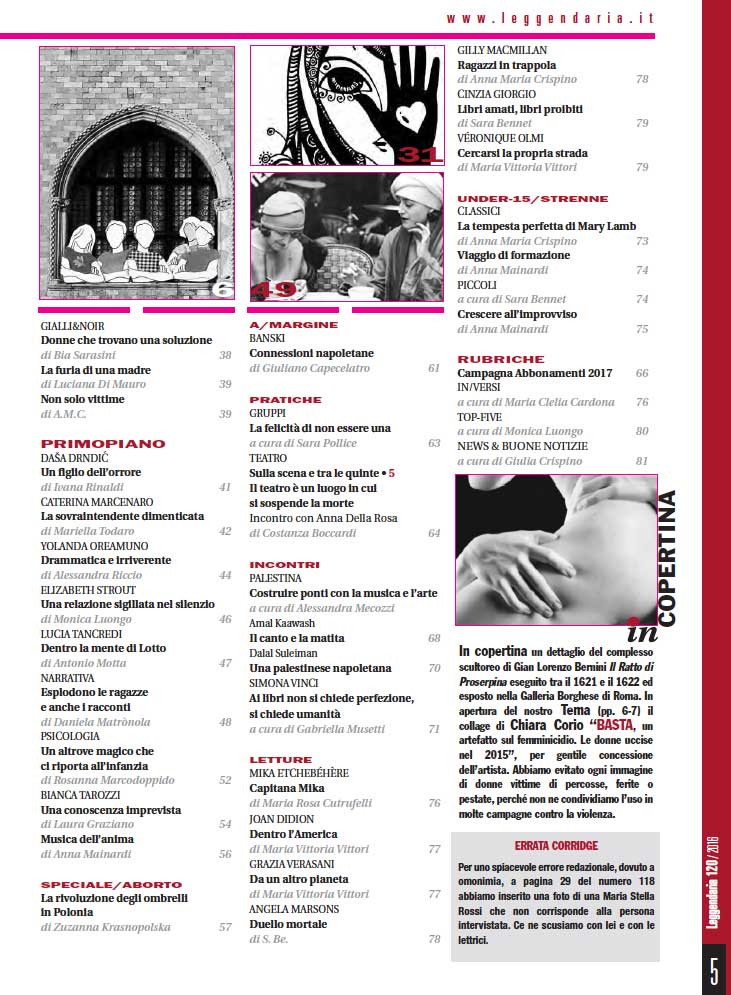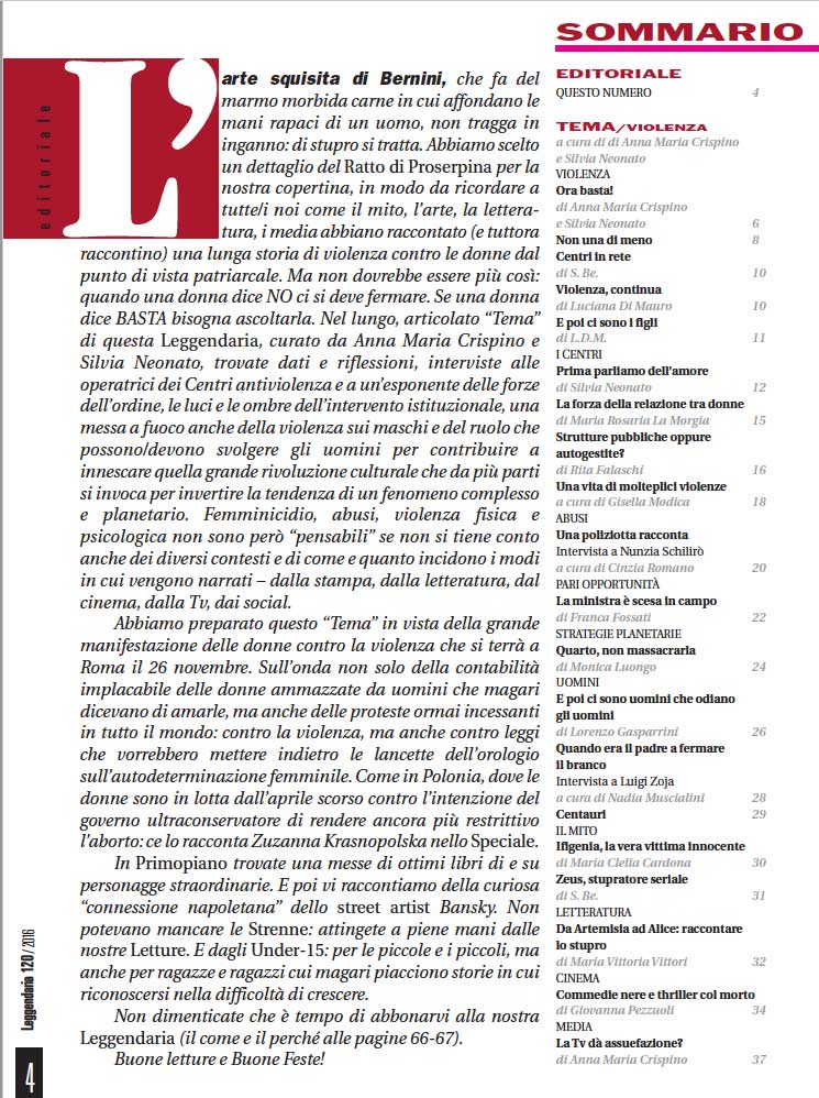 L’arte squisita di Bernini, che fa del marmo morbida carne in cui affondano le mani rapaci di un uomo, non tragga in inganno: di stupro si tratta. Abbiamo scelto un dettaglio del Ratto di Proserpina per la nostra copertina, in modo da ricordare a tut te/i noi come il mito, l’arte, la letteratura, i media abbiano raccontato (e tuttora raccontino) una lunga storia di violenza contro le donne dal punto di vista patriarcale. Ma non dovrebbe essere più così: quando una donna dice NO ci si deve fermare. Se una donna dice BASTA bisogna ascoltarla. Nel lungo, articolato “Tema” di questa Leggendaria, curato da Anna Maria Crispino e Silvia Neonato, trovate dati e riflessioni, interviste alle operatrici dei Centri antiviolenza e a un’esponente delle forze dell’ordine, le luci e le ombre dell’intervento istituzionale, una messa a fuoco anche della violenza sui maschi e del ruolo che possono/devono svolgere gli uomini per contribuire a innescare quella grande rivoluzione culturale che da più parti si invoca per invertire la tendenza di un fenomeno complesso e planetario. Femminicidio, abusi, violenza fisica e psicologica non sono però “pensabili” se non si tiene conto anche dei diversi contesti e di come e quanto incidono i modi in cui vengono narrati – dalla stampa, dalla letteratura, dal cinema, dalla Tv, dai social. Abbiamo preparato questo “Tema” in vista della grande manifestazione delle donne contro la violenza che si terrà a Roma il 26 novembre. Sull’onda non solo della contabilità